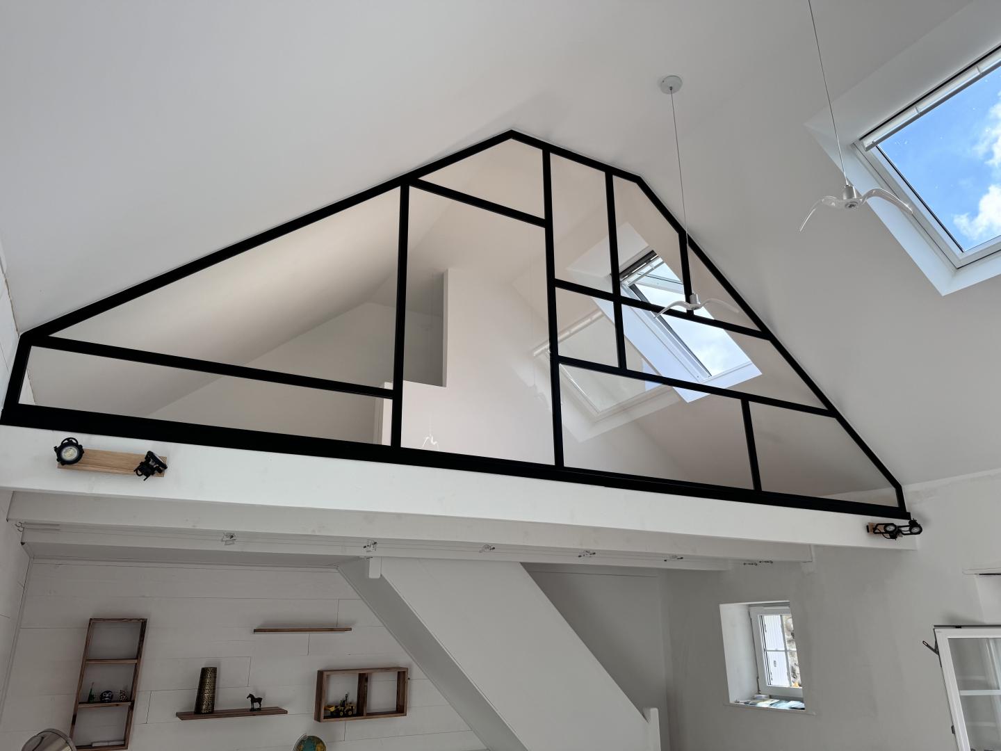 Verrière intérieure métal type "atelier" fixe ou ouvrante, grilles décoratives avec volutes et motifs forgé, pare-vue, pare-vent,...